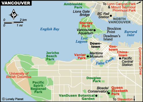 Even after a hard night, you won't catch Vancouver needing make-up. Blessed from birth with perfect bone structure, the city has a photogenic facade and effortless chic that are often compared to San Francisco's. Nestled snugly between mountains and sea, it lies on a strip of land bounded on the north by Burrard Inlet and on the south by Fraser River.